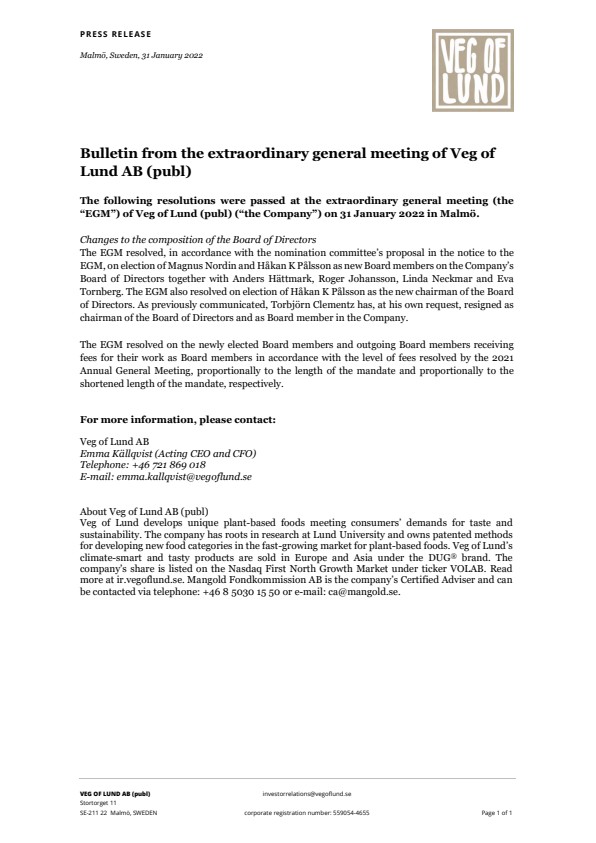 Veg of Lund develops unique plant-based foods meeting consumers’ demands for taste and sustainability. The company has roots in research at Lund University and owns patented methods for developing new food categories in the fast-growing market for plant-based foods. Veg of Lund’s climate-smart and tasty products are sold in Europe and Asia under the DUG® brand. The company’s share is listed on the Nasdaq First North Growth Market under ticker VOLAB. Read more at ir.vegoflund.se. Mangold Fondkommission AB is the company’s Certified Adviser and can be contacted via telephone: +46 8 5030 15 50 or e-mail: ca@mangold.se.