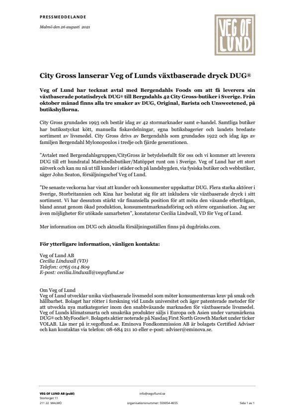 Veg of Lund utvecklar unika växtbaserade livsmedel som möter konsumenternas krav på smak och hållbarhet. Bolaget har rötter i forskning vid Lunds universitet och äger patenterade metoder för att utveckla nya matkategorier inom den snabbväxande marknaden för växtbaserade livsmedel. Veg of Lunds klimatsmarta och smakrika produkter säljs i Europa och Asien under varumärkena DUG® och MyFoodie®. Bolagets aktier noterade på Nasdaq First North Growth Market under ticker VOLAB. Läs mer på ir.vegoflund.se. Eminova Fondkommission AB är bolagets Certified Adviser och kan kontaktas via telefon: 08-684 211 10 eller e-post: adviser@eminova.se.