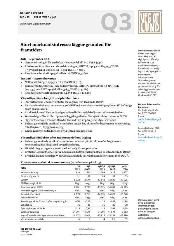 Denna information är sådan som Veg of Lund AB (publ) är skyldigt att offentliggöra enligt EU:s marknadsmissbruksförordning och enligt lag om värdepappersmarknaden. Informationen lämnades, genom ovanstående kontaktpersons försorg, för offentliggörande den 9 november 2021, klockan 08.00 CEST.