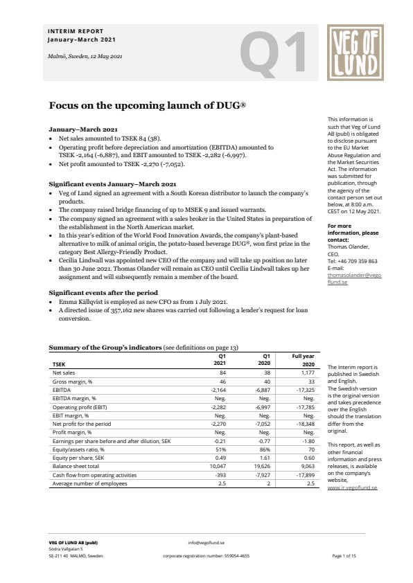 This information is such that Veg of Lund AB (publ) is obligated to disclose pursuant to the EU Market Abuse Regulation and the Market Securities Act. The information was submitted for publication, through the agency of the contact person set out below, at 8:00 a.m. CEST on 12 May 2021.