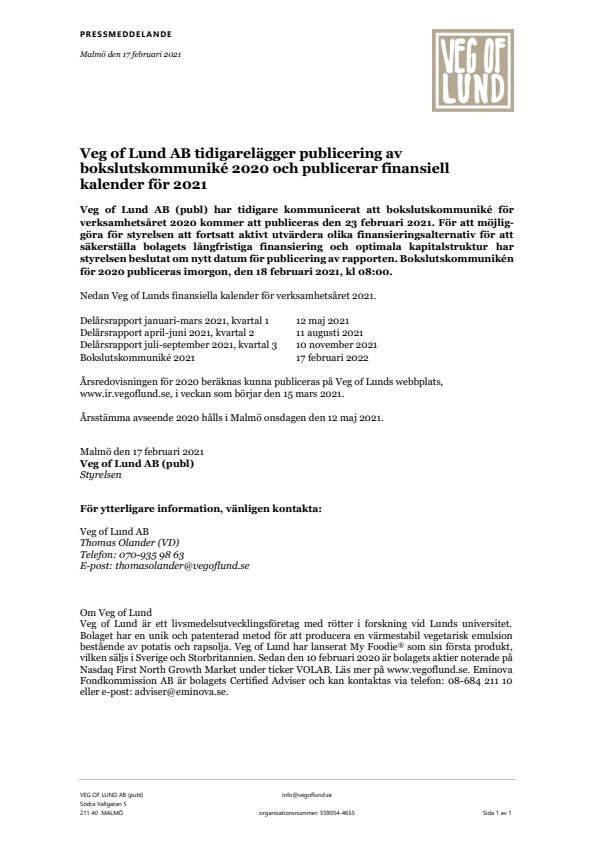 Årsredovisningen för 2020 beräknas kunna publiceras på Veg of Lunds webbplats, www.ir.vegoflund.se, i veckan som börjar den 15 mars 2021.