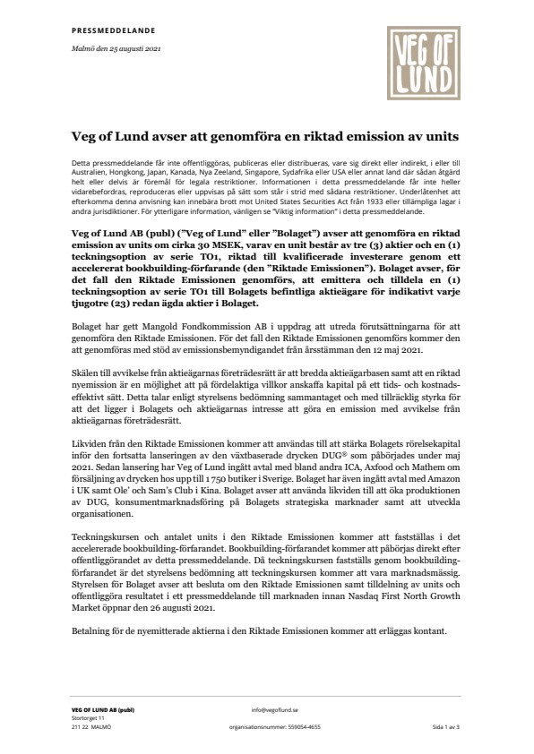Veg of Lund AB (publ) (”Veg of Lund” eller ”Bolaget”) avser att genomföra en riktad emission av units om cirka 30 MSEK, varav en unit består av tre (3) aktier och en (1) teckningsoption av serie TO1, riktad till kvalificerade investerare genom ett accelererat bookbuilding-förfarande (den ”Riktade Emissionen”). Bolaget avser, för det fall den Riktade Emissionen genomförs, att emittera och tilldela en (1) teckningsoption av serie TO1 till Bolagets befintliga aktieägare för indikativt varje tjugotre (23) redan ägda aktier i Bolaget.