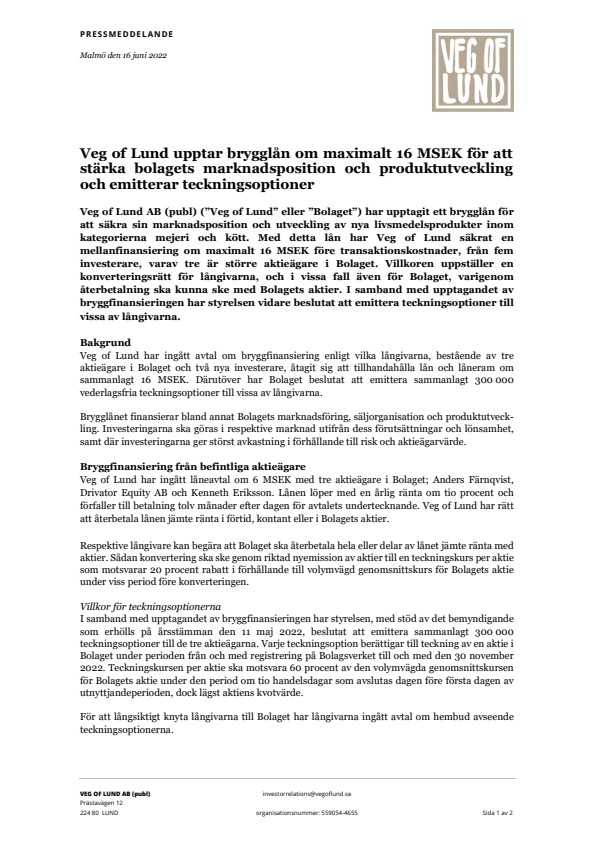 Veg of Lund har ingått avtal om bryggfinansiering enligt vilka långivarna, bestående av tre aktieägare i Bolaget och två nya investerare, åtagit sig att tillhandahålla lån och låneram om sammanlagt 16 MSEK. Därutöver har Bolaget beslutat att emittera sammanlagt 300 000 vederlagsfria teckningsoptioner till vissa av långivarna.