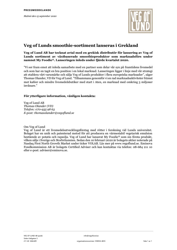 Veg of Lund är ett livsmedelsutvecklingsföretag med rötter i forskning vid Lunds universitet. Bolaget har en unik och patenterad metod för att producera en värmestabil vegetarisk emulsion bestående av potatis och rapsolja. Veg of Lund har lanserat My Foodie® som sin första produkt, vilken säljs i Sverige och Storbritannien. Sedan den 10 februari 2020 är bolagets aktier noterade på Nasdaq First North Growth Market under ticker VOLAB. Läs mer på www.vegoflund.se. Eminova Fondkommission AB är bolagets Certified Adviser och kan kontaktas via telefon: 08-684 211 10 eller e-post: adviser@eminova.se.