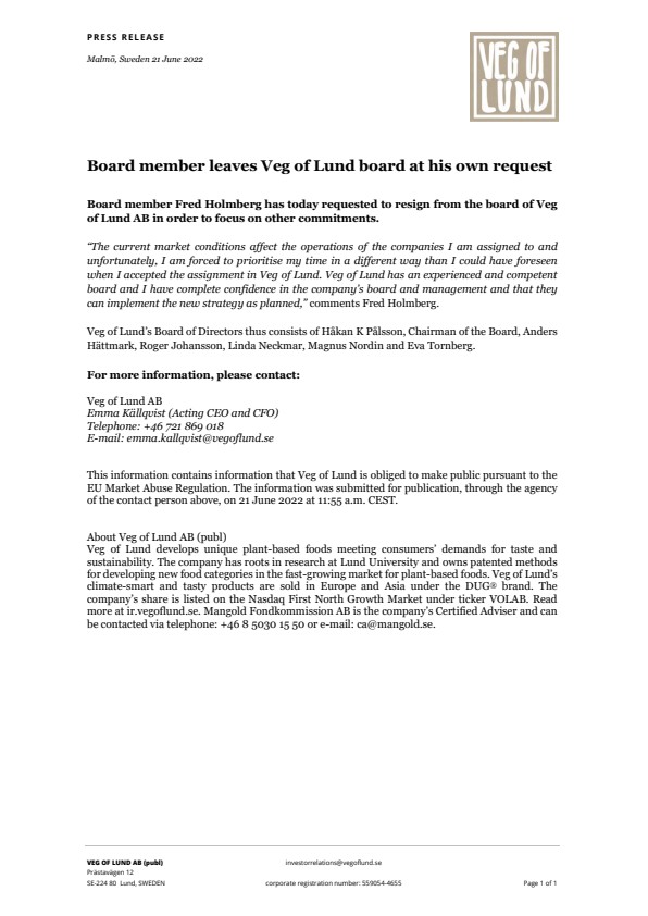 This information contains information that Veg of Lund is obliged to make public pursuant to the EU Market Abuse Regulation. The information was submitted for publication, through the agency of the contact person above, on 21 June 2022 at 11:55 a.m. CEST.