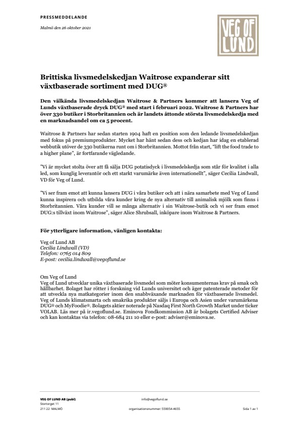 ”Vi ser fram emot att kunna lansera DUG i våra butiker och att i nära samarbete med Veg of Lund kunna inspirera och utbilda våra kunder kring de nya alternativ till animalisk mjölk som finns i Storbritannien. Våra kunder vill se många alternativ i sin Waitrose-butik och vi ser fram emot DUG:s tillväxt inom Waitrose”, säger Alice Shrubsall, inköpare inom Waitrose & Partners.