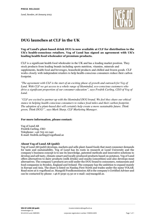 Veg of Lund AB (publ) develops, markets and sells plant-based foods that meet consumer demands for taste and sustainability. Veg of Lund has its roots in research at Lund University and the company’s business concept is to use its knowledge, patented methods and innovative solutions to develop and sell tasty, climate-smart and locally produced products based on potatoes. Veg of Lund offers alternatives to dairy products (milk drinks) and snacks (smoothies) and also develops meat alternatives. The company’s products are sold under the DUG brand to consumers, restaurants and food companies in Sweden, England and Ireland. The company has the ambition to expand mainly in Europe and Asia. The share is listed on Nasdaq First North and trades under the name VOLAB. Read more at ir.vegoflund.se. Mangold Fondkommission AB is the company’s Certified Adviser and can be contacted by phone: +46 8 5030 15 50 or e-mail: ca@mangold.se.