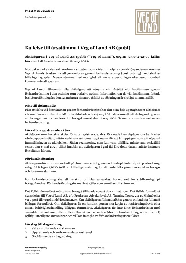 Veg of Lund välkomnar alla aktieägare att utnyttja sin rösträtt vid årsstämman genom förhandsröstning i den ordning som beskrivs nedan. Information om de vid årsstämman fattade besluten offentliggörs den 12 maj 2021 så snart utfallet av röstningen är slutligt sammanställt.