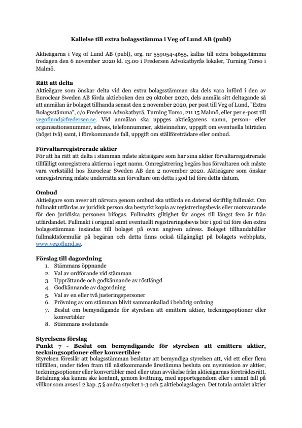 Aktieägare som önskar delta vid den extra bolagsstämman ska dels vara införd i den av Euroclear Sweden AB förda aktieboken den 29 oktober 2020, dels anmäla sitt deltagande så att anmälan är bolaget tillhanda senast den 2 november 2020, per post till Veg of Lund, ”Extra Bolagsstämma”, c/o Fredersen Advokatbyrå, Turning Torso, 211 15 Malmö, eller per e-post till vegoflund@fredersen.se. Vid anmälan ska uppges aktieägarens namn, person- eller organisationsnummer, adress, telefonnummer, aktieinnehav, uppgift om eventuella biträden (högst två) samt, i förekommande fall, uppgift om ställföreträdare eller ombud.
