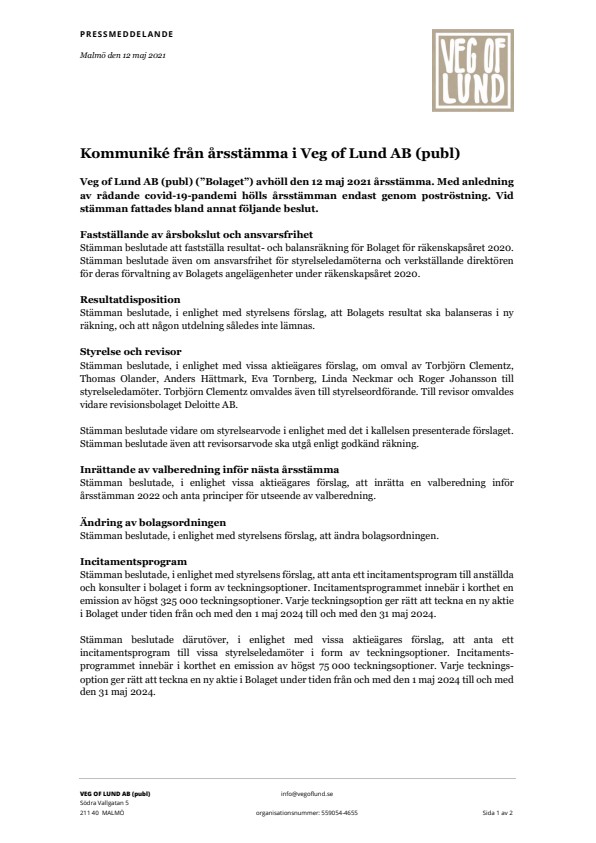 Veg of Lund utvecklar unika växtbaserade livsmedel som möter konsumenternas krav på smak och hållbarhet. Bolaget har rötter i forskning vid Lunds universitet och äger patenterade metoder för att utveckla nya matkategorier inom den snabbväxande marknaden för växtbaserade livsmedel. Veg of Lunds klimatsmarta och smakrika produkter säljs i Europa och Asien under varumärkena DUG® och MyFoodie®. Bolagets aktier noterade på Nasdaq First North Growth Market under ticker VOLAB. Läs mer på ir.vegoflund.se. Eminova Fondkommission AB är bolagets Certified Adviser och kan kontaktas via telefon: 08-684 211 10 eller e-post: adviser@eminova.se.