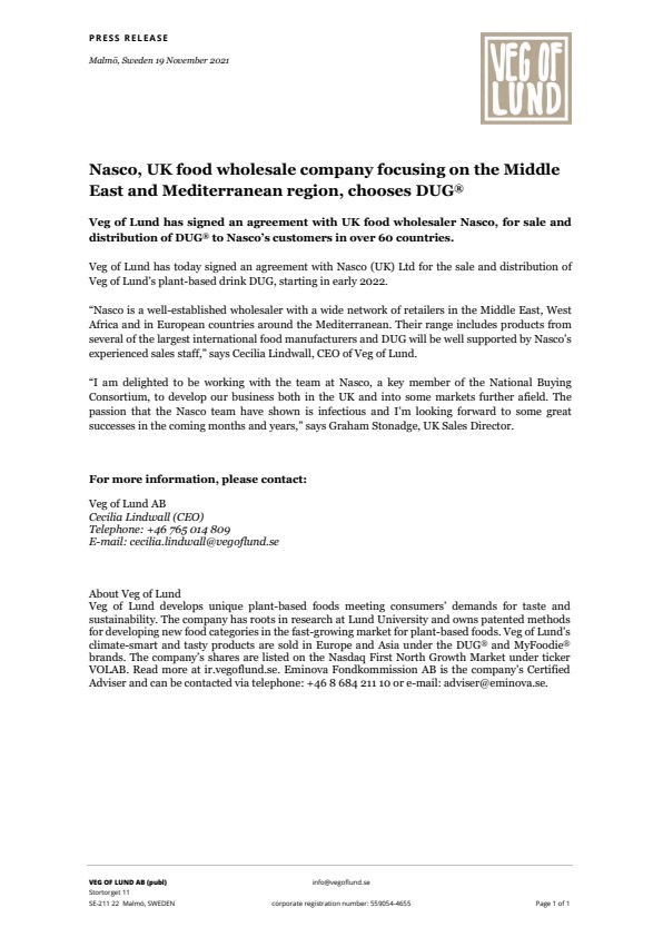 Veg of Lund has today signed an agreement with Nasco (UK) Ltd for the sale and distribution of Veg of Lund’s plant-based drink DUG, starting in early 2022.
