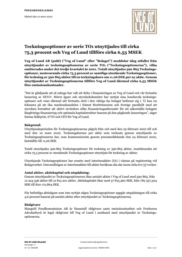 Denna information är sådan som Veg of Lund AB (publ) är skyldigt att offentliggöra enligt EU:s marknadsmissbruksförordning. Informationen lämnades, genom ovanstående kontaktpersons försorg, för offentliggörande den 12 mars 2022 kl. 09.10 CET.
