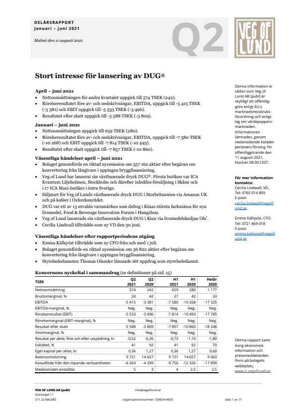 Denna information är sådan som Veg of Lund AB (publ) är skyldigt att offentliggöra enligt EU:s marknadsmissbruksförordning och enligt lag om värdepappersmarknaden. Informationen lämnades, genom ovanstående kontaktpersons försorg, för offentliggörande den 11 augusti 2021, klockan 08.00 CEST.