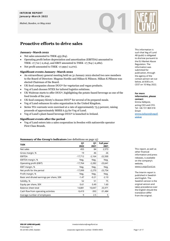 A more in-depth description of the Board of Directors’ decision on the clarified business model, updated strategy and revised objectives for Veg of Lund is provided in a separate press release issued today, 10 May 2022.