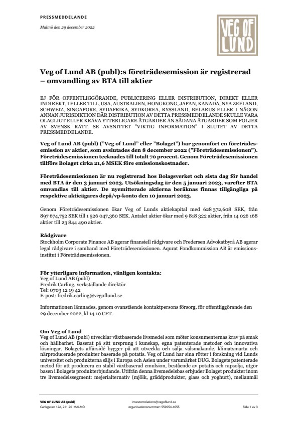 Detta pressmeddelande utgör inte ett erbjudande att förvärva, teckna eller på annat sätt handla med aktier, teckningsoptioner, teckningsrätter, BTA eller andra värdepapper i Veg of Lund AB (publ) och investerare ska inte teckna eller förvärva några värdepapper annat än på grundval av informationen i det EU-tillväxtprospekt som har offentliggjorts före inledningen av teckningsperioden i Företrädesemissionen omkring den 23 november 2022. Ingen åtgärd har vidtagits och åtgärder kommer inte att vidtas för att tillåta ett erbjudande till allmänheten i några andra jurisdiktioner än Sverige.