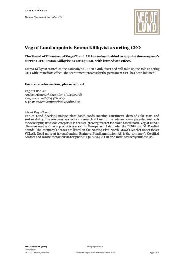 Veg of Lund develops unique plant-based foods meeting consumers’ demands for taste and sustainability. The company has roots in research at Lund University and owns patented methods for developing new food categories in the fast-growing market for plant-based foods. Veg of Lund’s climate-smart and tasty products are sold in Europe and Asia under the DUG® and MyFoodie® brands. The company’s shares are listed on the Nasdaq First North Growth Market under ticker VOLAB. Read more at ir.vegoflund.se. Eminova Fondkommission AB is the company’s Certified Adviser and can be contacted via telephone: +46 8 684 211 10 or e-mail: adviser@eminova.se.