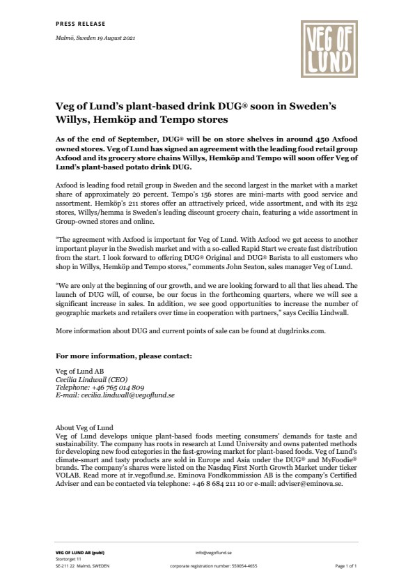 Veg of Lund develops unique plant-based foods meeting consumers’ demands for taste and sustainability. The company has roots in research at Lund University and owns patented methods for developing new food categories in the fast-growing market for plant-based foods. Veg of Lund’s climate-smart and tasty products are sold in Europe and Asia under the DUG® and MyFoodie® brands. The company’s shares were listed on the Nasdaq First North Growth Market under ticker VOLAB. Read more at ir.vegoflund.se. Eminova Fondkommission AB is the company’s Certified Adviser and can be contacted via telephone: +46 8 684 211 10 or e-mail: adviser@eminova.se.
