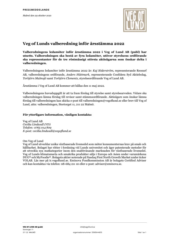 Valberedningens huvuduppgift är att ta fram förslag till styrelse samt styrelsearvoden. Vidare ska valberedningen lämna förslag till revisor samt stämmoordförande. Aktieägare som önskar lämna förslag till valberedningen kan skicka e-post till valberedningen@vegoflund.se eller brev till Veg of Lund, attn: valberedningen, Stortorget 11, 211 22 Malmö.