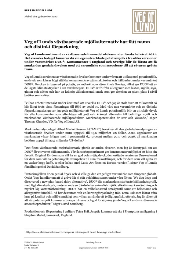 ”Vi har arbetat intensivt under året med att utveckla DUG® och jag är stolt över att vi kommit så här långt trots vissa förseningar till följd av covid-19. Med vårt nya varumärke och en distinkt förpackningsdesign ser jag goda möjligheter att Veg of Lunds potatismjölk blir en attraktiv dryck för alla konsumenter som efterfrågar ett gott och krämigt alternativ till befintliga mjölk och marknadens växtbaserade mjölkprodukter. Marknadspotentialen är stor och växande,” säger Thomas Olander, VD för Veg of Lund AB.
