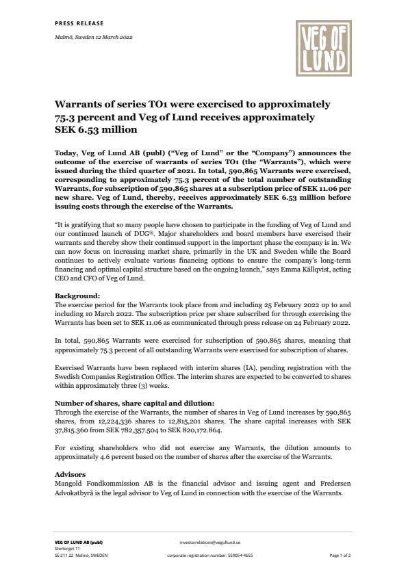 Through the exercise of the Warrants, the number of shares in Veg of Lund increases by 590,865 shares, from 12,224,336 shares to 12,815,201 shares. The share capital increases with SEK 37,815.360 from SEK 782,357.504 to SEK 820,172.864.