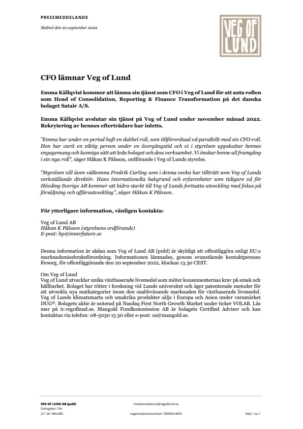 Denna information är sådan som Veg of Lund AB (publ) är skyldigt att offentliggöra enligt EU:s marknadsmissbruksförordning. Informationen lämnades, genom ovanstående kontaktpersons försorg, för offentliggörande den 20 september 2022, klockan 13.30 CEST.