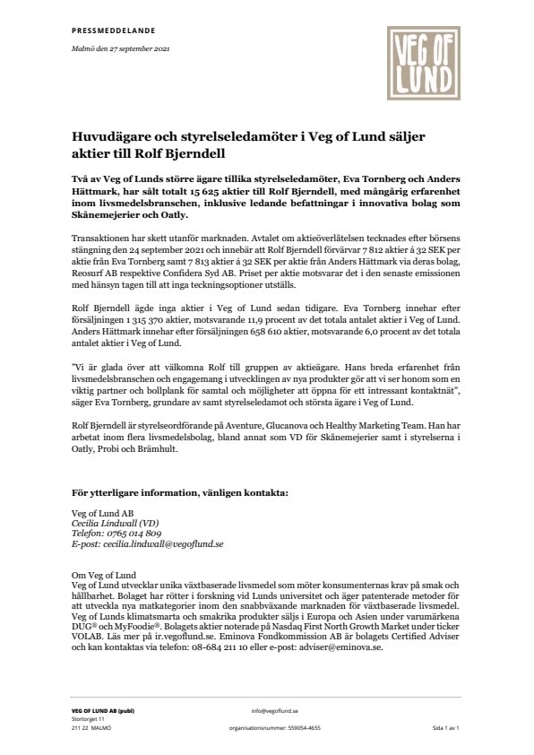 Rolf Bjerndell ägde inga aktier i Veg of Lund sedan tidigare. Eva Tornberg innehar efter försäljningen 1 315 370 aktier, motsvarande 11,9 procent av det totala antalet aktier i Veg of Lund. Anders Hättmark innehar efter försäljningen 658 610 aktier, motsvarande 6,0 procent av det totala antalet aktier i Veg of Lund.