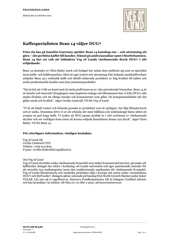 ”Det är kul att vi får en kund med så stark profil inom en av våra prioriterade branscher. Bean 14 är en kreativ och innovativ föregångare som inspirerar många och tillsammans kan vi lyfta DUG:s alla starka fördelar och nå viktiga kunder och konsumenter som gillar vår kompromisslöshet när det gäller smak och kvalitet”, säger Cecilia Lindwall, VD för Veg of Lund.
