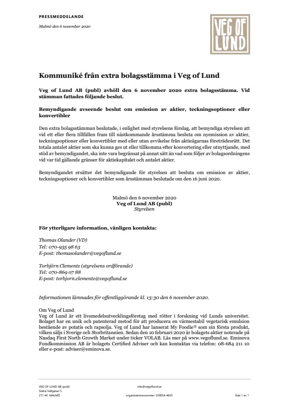 Veg of Lund är ett livsmedelsutvecklingsföretag med rötter i forskning vid Lunds universitet. Bolaget har en unik och patenterad metod för att producera en värmestabil vegetarisk emulsion bestående av potatis och rapsolja. Veg of Lund har lanserat My Foodie® som sin första produkt, vilken säljs i Sverige och Storbritannien. Sedan den 10 februari 2020 är bolagets aktier noterade på Nasdaq First North Growth Market under ticker VOLAB. Läs mer på www.vegoflund.se. Eminova Fondkommission AB är bolagets Certified Adviser och kan kontaktas via telefon: 08-684 211 10 eller e-post: adviser@eminova.se.