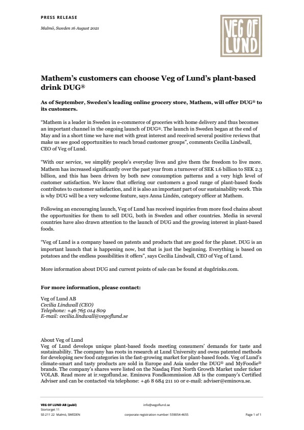 Veg of Lund develops unique plant-based foods meeting consumers’ demands for taste and sustainability. The company has roots in research at Lund University and owns patented methods for developing new food categories in the fast-growing market for plant-based foods. Veg of Lund’s climate-smart and tasty products are sold in Europe and Asia under the DUG® and MyFoodie® brands. The company’s shares were listed on the Nasdaq First North Growth Market under ticker VOLAB. Read more at ir.vegoflund.se. Eminova Fondkommission AB is the company’s Certified Adviser and can be contacted via telephone: +46 8 684 211 10 or e-mail: adviser@eminova.se.