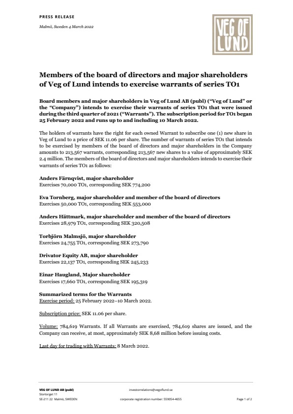 Board members and major shareholders in Veg of Lund AB (publ) (“Veg of Lund” or the “Company”) intends to exercise their warrants of series TO1 that were issued during the third quarter of 2021 (“Warrants”). The subscription period for TO1 began 25 February 2022 and runs up to and including 10 March 2022.