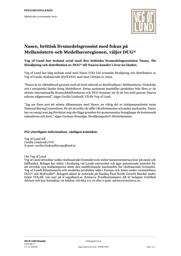 Veg of Lund har idag tecknat avtal med Nasco (UK) Ltd avseende försäljning och distribution av Veg of Lunds växtbaserade dryck DUG med start i början av 2022.