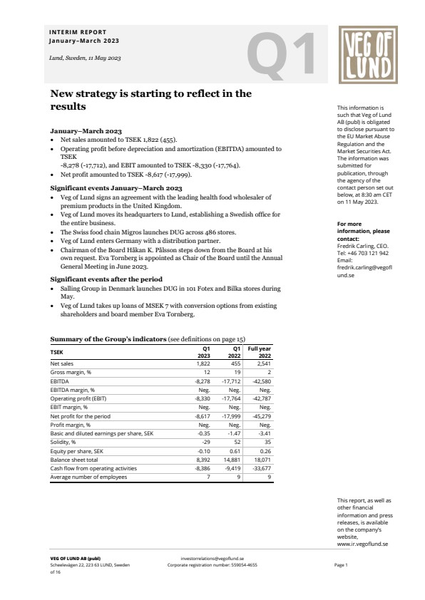 - Veg of Lund takes up loans of MSEK 7 with conversion options from existing shareholders and board member Eva Tornberg.