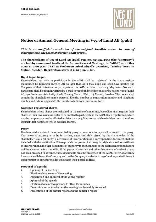 The shareholders of Veg of Lund AB (publ) reg. no. 559054-4655 (the “Company”) are hereby summoned to attend the Annual General Meeting (the “AGM”) on 11 May 2022 at 3:00 p.m. CEST at Fredersen Advokatbyrå’s premises, Turning Torso in Malmö, Sweden. Registration starts at 2:30 p.m. CEST.