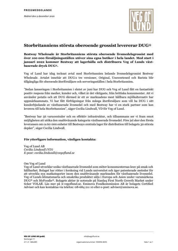 Veg of Lund har idag tecknat avtal med Storbritannien ledande livsmedelsgrossist Bestway Wholesale. Avtalet innebär att DUG:s tre versioner, Original, Unsweetened och Barista blir tillgängliga för oberoende återförsäljare och serveringsställen i hela Storbritannien.