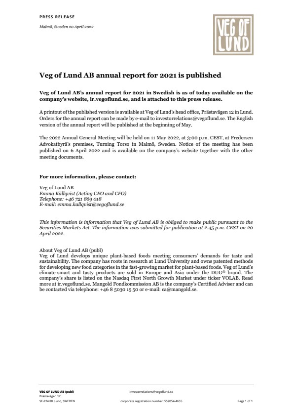 This information is information that Veg of Lund AB is obliged to make public pursuant to the Securities Markets Act. The information was submitted for publication at 2:45 p.m. CEST on 20 April 2022.