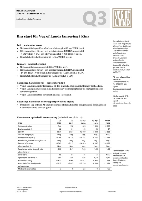 Denna information är sådan som Veg of Lund AB (publ) är skyldigt att offentliggöra enligt EU:s marknadsmissbruksförordning. Informationen lämnades, genom ovanstående kontaktpersoners försorg, för offentliggörande den 28 oktober 2020, klockan 08.00 CET.