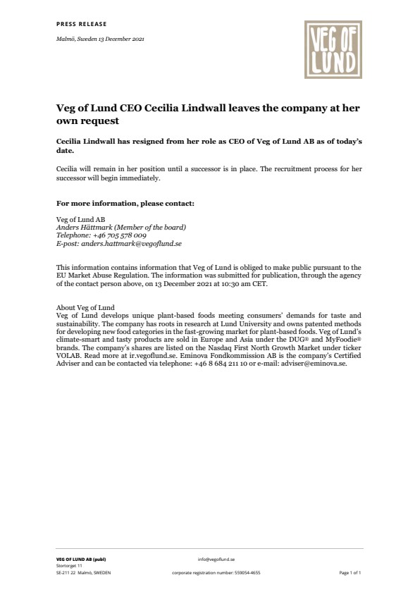 This information contains information that Veg of Lund is obliged to make public pursuant to the EU Market Abuse Regulation. The information was submitted for publication, through the agency of the contact person above, on 13 December 2021 at 10:30 am CET.