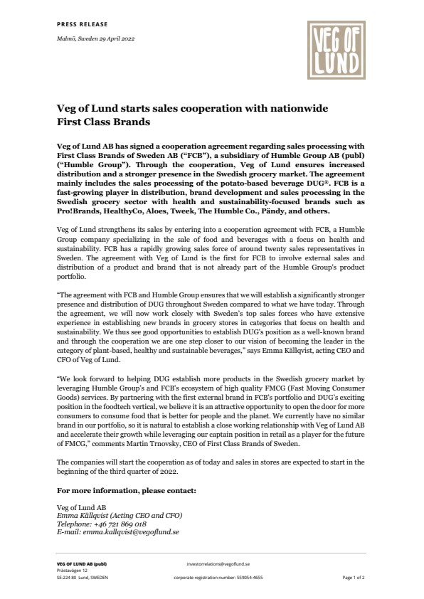 Veg of Lund stärker sin försäljning genom att ingå ett samarbetsavtal med FCB, ett bolag i Humble Group som är specialiserat på försäljning av mat och dryck med fokus på hälsa och hållbarhet. FCB har en snabbt växande säljkår med ett tjugotal säljare i Sverige. Avtalet med Veg of Lund är det första för FCB som avser extern försäljning och distribution av en produkt och varumärke som inte redan ingår i Humble Groups produktportfölj.