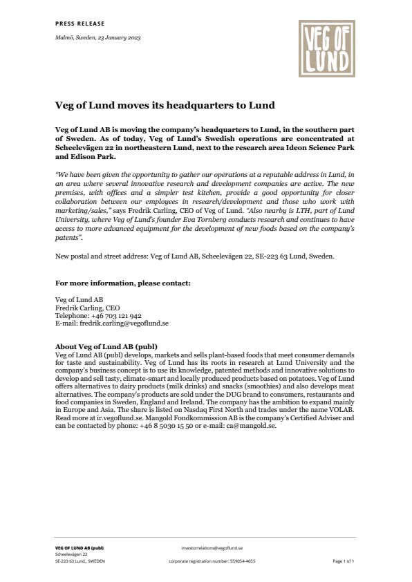 Veg of Lund AB (publ) develops, markets and sells plant-based foods that meet consumer demands for taste and sustainability. Veg of Lund has its roots in research at Lund University and the company’s business concept is to use its knowledge, patented methods and innovative solutions to develop and sell tasty, climate-smart and locally produced products based on potatoes. Veg of Lund offers alternatives to dairy products (milk drinks) and snacks (smoothies) and also develops meat alternatives. The company’s products are sold under the DUG brand to consumers, restaurants and food companies in Sweden, England and Ireland. The company has the ambition to expand mainly in Europe and Asia. The share is listed on Nasdaq First North and trades under the name VOLAB. Read more at ir.vegoflund.se. Mangold Fondkommission AB is the company’s Certified Adviser and can be contacted by phone: +46 8 5030 15 50 or e-mail: ca@mangold.se.
