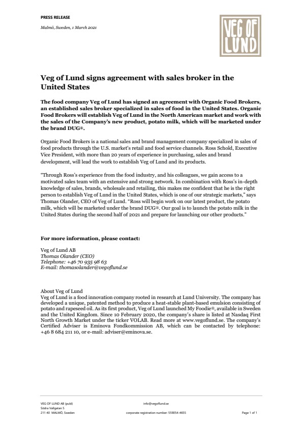 “Through Ross’s experience from the food industry, and his colleagues, we gain access to a motivated sales team with an extensive and strong network. In combination with Ross’s in-depth knowledge of sales, brands, wholesale and retailing, this makes me confident that he is the right person to establish Veg of Lund in the United States, which is one of our strategic markets,” says Thomas Olander, CEO of Veg of Lund. “Ross will begin work on our latest product, the potato milk, which will be marketed under the brand DUG®. Our goal is to launch the potato milk in the United States during the second half of 2021 and prepare for launching our other products.”