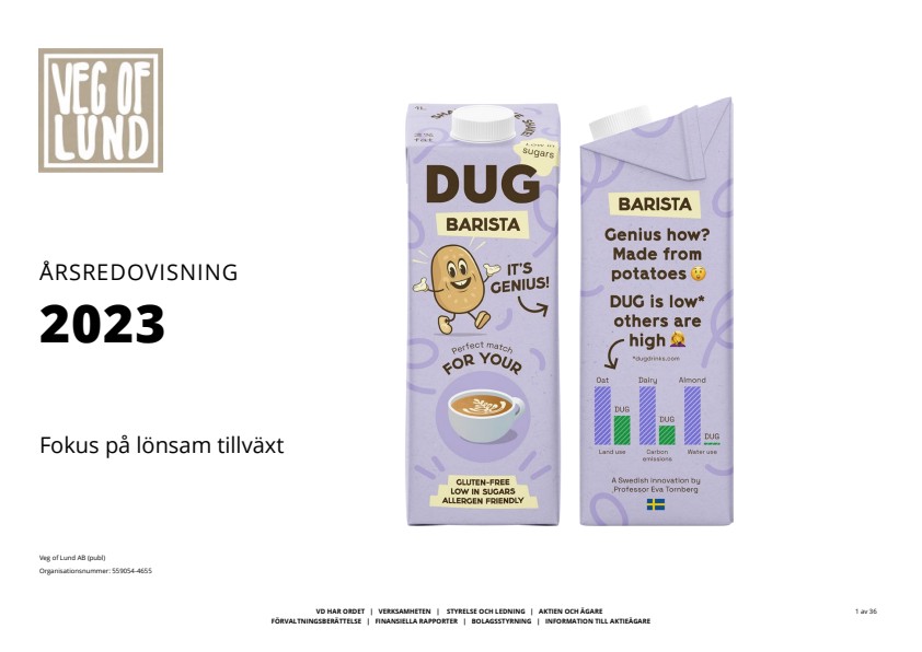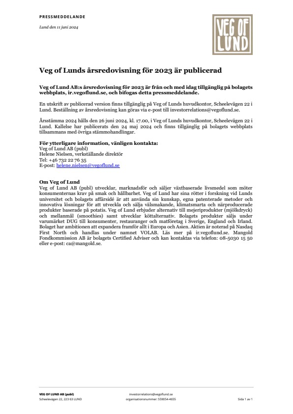 Veg of Lund AB (publ) utvecklar, marknadsför och säljer växtbaserade livsmedel som möter konsumenternas krav på smak och hållbarhet. Veg of Lund har sina rötter i forskning vid Lunds universitet och bolagets affärsidé är att använda sin kunskap, egna patenterade metoder och innovativa lösningar för att utveckla och sälja välsmakande, klimatsmarta och närproducerade produkter baserade på potatis. Veg of Lund erbjuder alternativ till mejeriprodukter (mjölkdryck) och mellanmål (smoothies) samt utvecklar köttalternativ. Bolagets produkter säljs under varumärket DUG till konsumenter, restauranger och matföretag i Sverige, England och Irland. Bolaget har ambitionen att expandera framför allt i Europa och Asien. Aktien är noterad på Nasdaq First North och handlas under namnet VOLAB. Läs mer på ir.vegoflund.se. Mangold Fondkommission AB är bolagets Certified Adviser och kan kontaktas via telefon: 08-5030 15 50 eller e-post: ca@mangold.se.