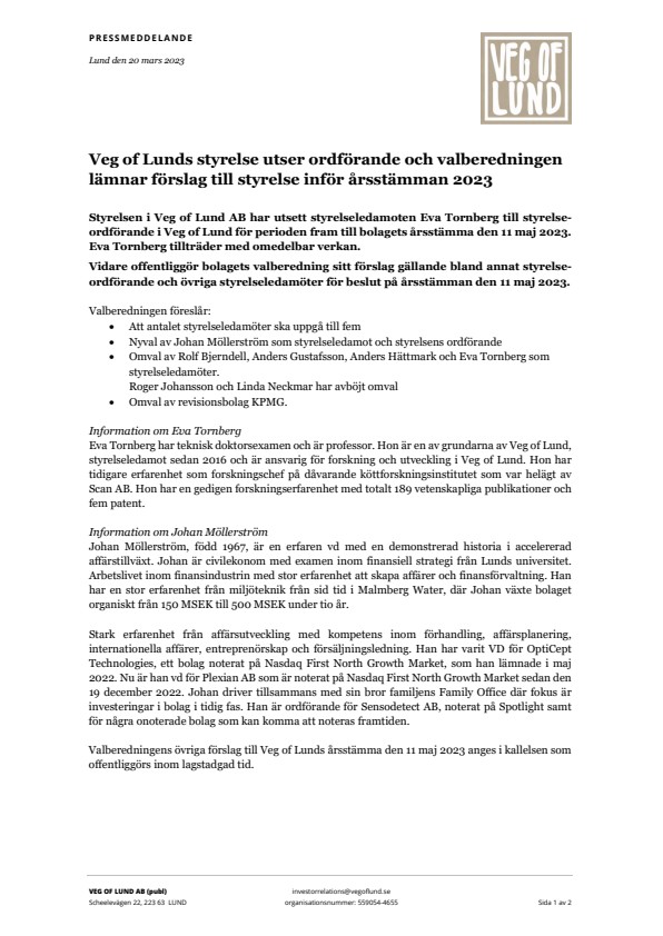 Valberedningens övriga förslag till Veg of Lunds årsstämma den 11 maj 2023 anges i kallelsen som offentliggörs inom lagstadgad tid.